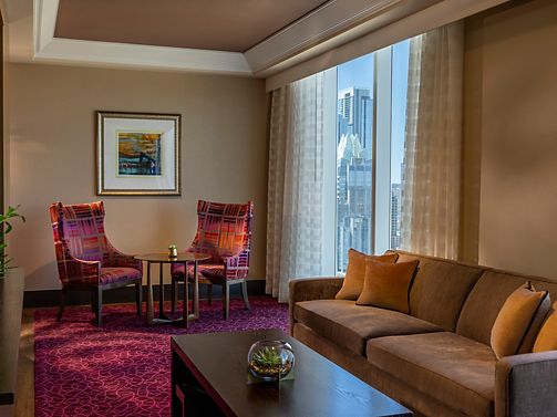 Top Floor Views, Separate Living and Dining, 2 Baths, private fitness space, Wet Bar, Deluxe Amenities, Can Connect to 2nd bedroom with additional reservation upon request. Access to Fairmont Gold Lounge during hours of operation.