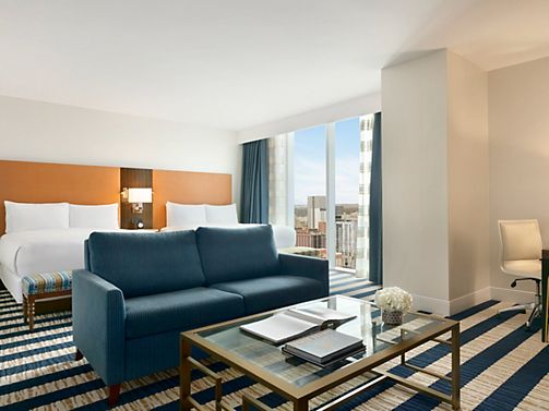 Spacious Living Area, 50in HDTV, City Skyline Views, Nespresso Coffee, Tea Kettle, Floors 31-37, 1 King plus 1 Queen Sofabed, can connect to 2nd room reservation on request