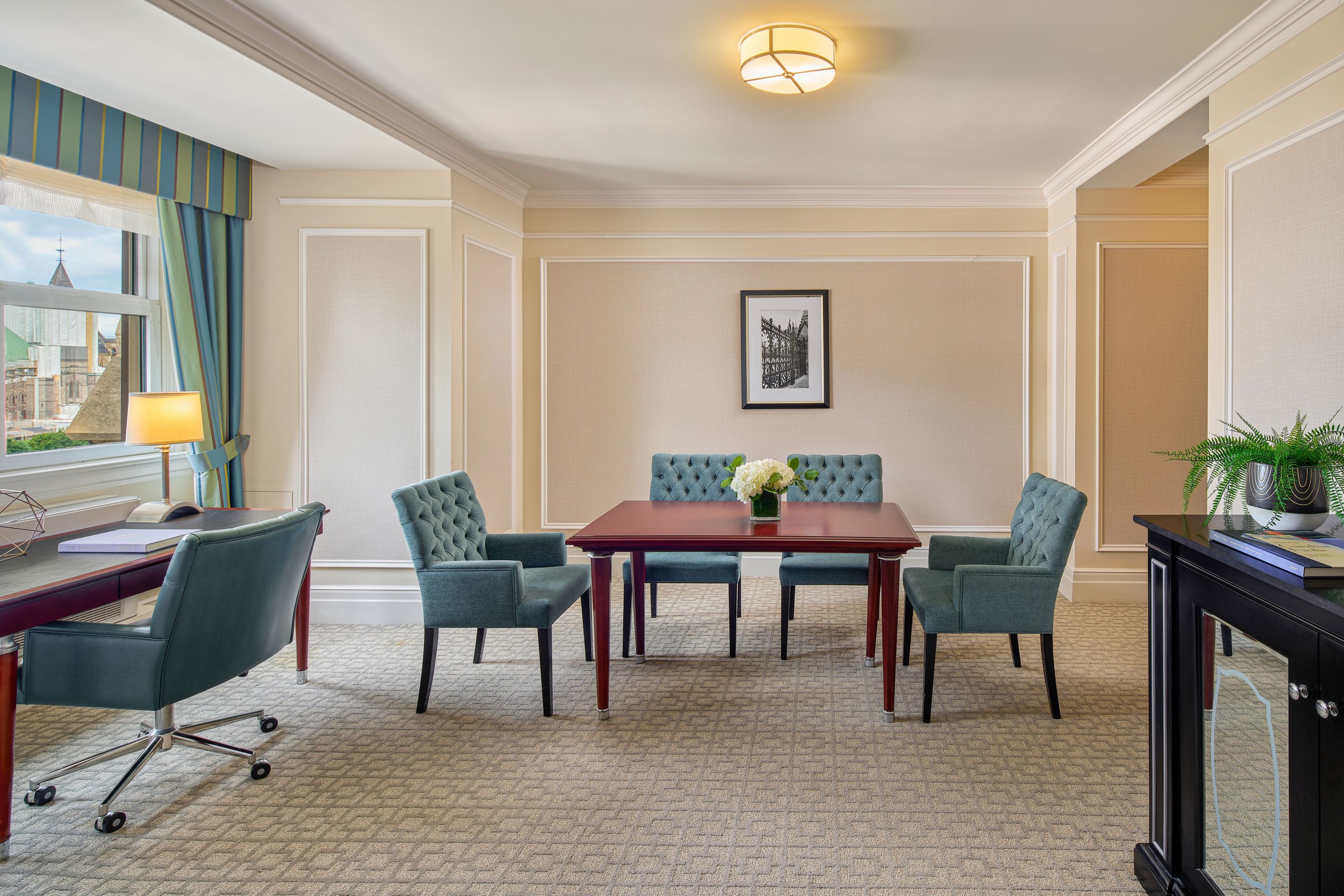 Suite spacieuse avec décoration inspirée du riche passé de la propriété, chambre et espace à vivre séparés vue sur la Colline du Parlement et sur le centre-ville d'Ottawa