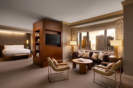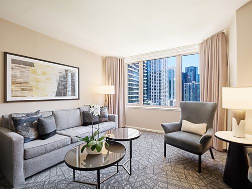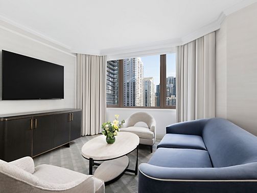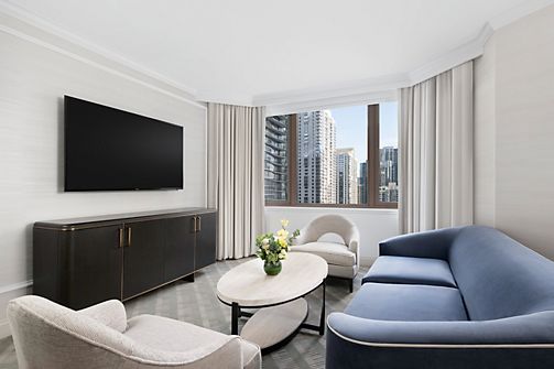 Suite with separate living room and bedroom. Magnificent views of Millennium Park and Lake Michigan. Stand alone shower, bathtub with vanity area for comfort. Spacious rooms include sitting area, work space.