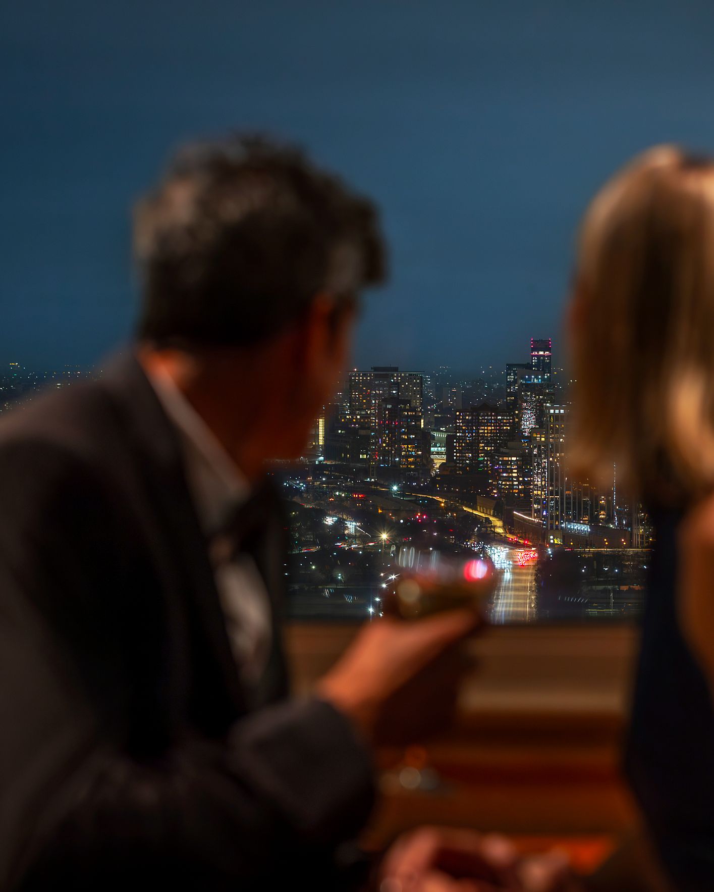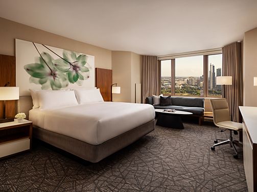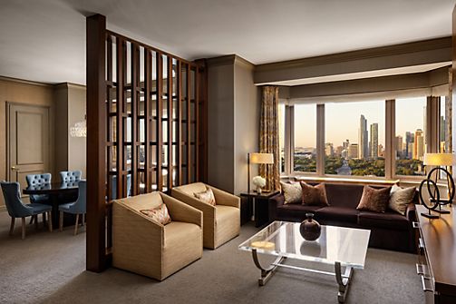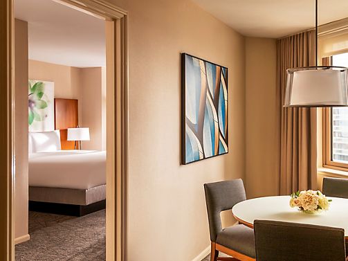 With sweeping city views and an amazing master bath, this suite is just the beginning for a stay to remember. Features dining room, seating area, and spacious bedroom.