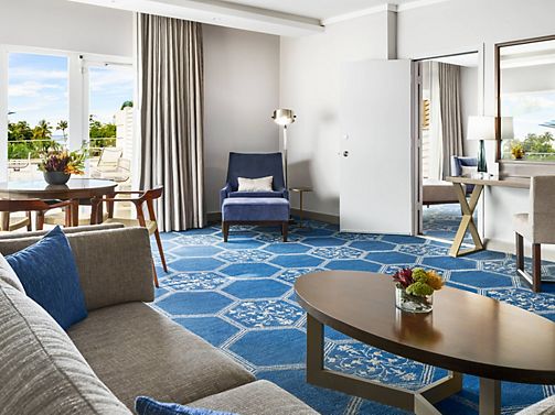 A warm welcome awaits in this spacious Suite. Its comfort relies on the partial ocean views of the floor-to-ceiling windows and sophisticated style of its spacious dining, sitting area, and adjoining bedrooms.