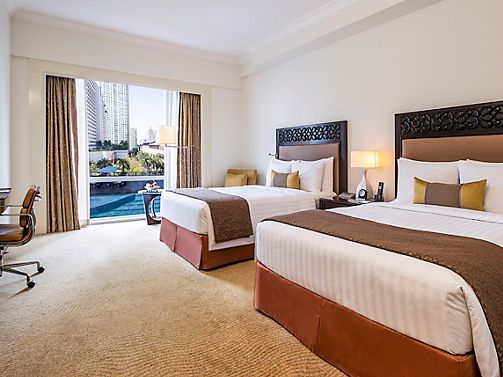 Overlooking the Fairmont Pool, this Deluxe Room offers two double beds and elegant surroundings for a restful stay. A perfect blend of comfort and quiet sophistication awaits in the heart of Makati.