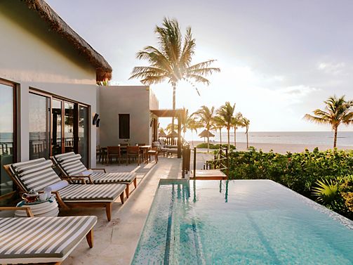 Scenic ocean views, infinity pool, living room and dining area. Enjoy Balam Butler service. Optional connecting Beach Front casita as 3rd room.