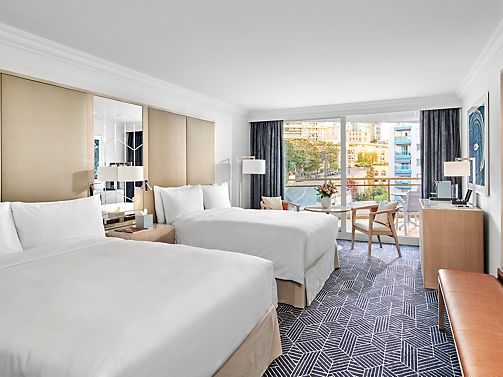 Inspired by the French Riviera and Monaco's heritage, with beige and blue color tones, this renovated 2 double beds room offering a large terrace overlooks the famous hairpin bend. Connected TV, coffee machine and digital technologies available. 35sqm.