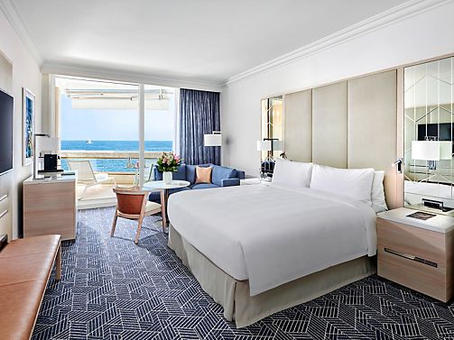 Located on high floors, this room offers connected technologies, blue and beige color design. Perfect to enjoy a breathtaking view of the Mediteranean Sea on the private terrace. Connected TV, coffee machine and digital technologies available. 35sqm.