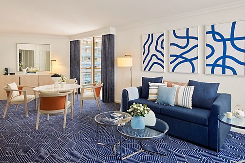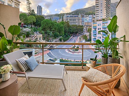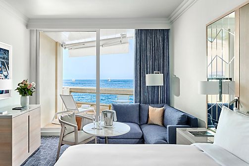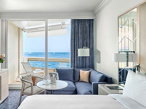 Inspired by Monaco's heritage, with beige and blue color tones, this newly renovated suite offers three private balconies overlooking the famous hairpin bend and the marina. Connected TV, coffee machine, digital technologies available. 85sqm.