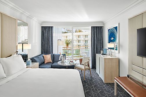Inspired by Monaco's heritage with beige and blue color tones and elegant bathroom, this renovated room offers a large terrace overlooking the lush garden of the hotel. Connected TV, coffee machine and digital technologies available. 35sqm.