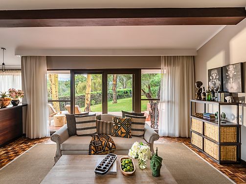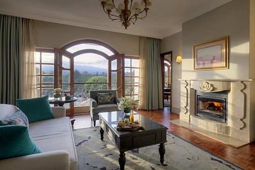 A spacious and elegant suite featuring a living area with sofa and a cosy fireplace with great views of the magnificent Mount Kenya or the expansive garden.