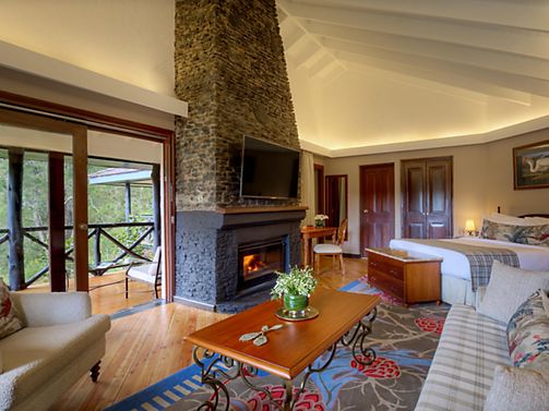 A one Bedroom spacious Suite which features a traditional decor designed with elegance and comfort. Comfortable living area with sofa bed, a beautiful stone fire place and a private terrace overlooking the forest.