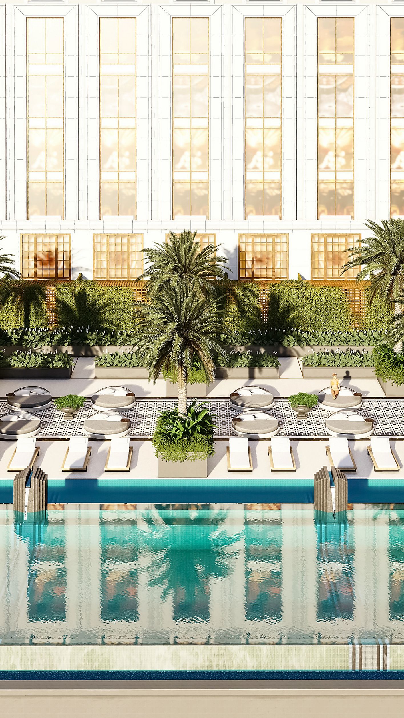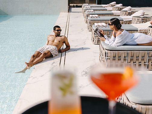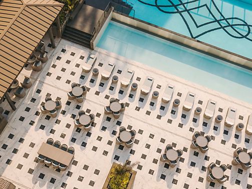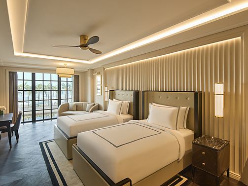 Bask in the vibrant pool view from this elegantly designed room with twin beds. Rich textures and modern accents create a tranquil escape, perfect for relaxation or business travel.
