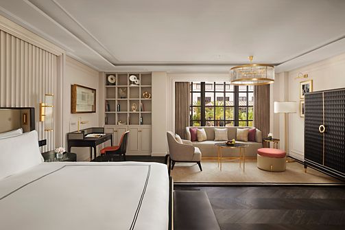 A luxurious suite where sophistication meets style. Enjoy Gold Lounge access, Fairmont Butler Service, and complimentary transport while immersing yourself in a serene space with eclectic interiors.