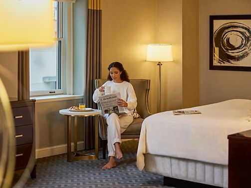 Located on the corner of the building, these rooms offer more space, as well as an additional window providing natural light. They feature spacious en-suite marble bathrooms with rain showers, intimate sitting areas, and workspace.