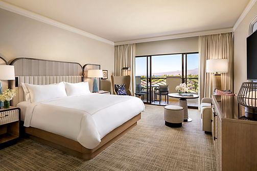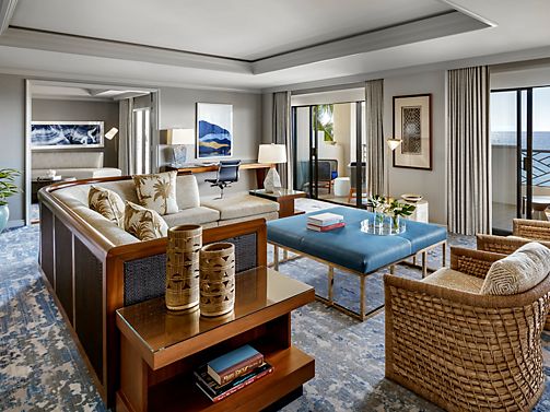 A spacious guest suite, residential in style, with views of the Pacific Ocean from a private patio. Offers a parlor area separated from the bedroom by French doors, wood and marble coffee console & writing desk. Includes Fairmont Gold services.
