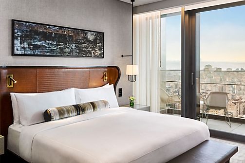 Looking over Istanbul with floor to ceiling windows, this contemporary room offers Gold Lounge access, a rain showers and your choice of bathtub or private Turkish bath, one king bed or two beds, accessible rooms available / 40 m2