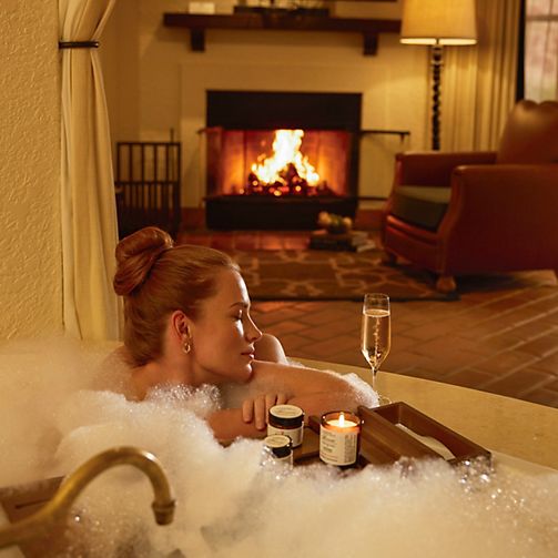 Spacious suite feature charming wood-burning fireplace and sitting area with sofabed. Bathroom with oversized soaking bathtub and separate shower.