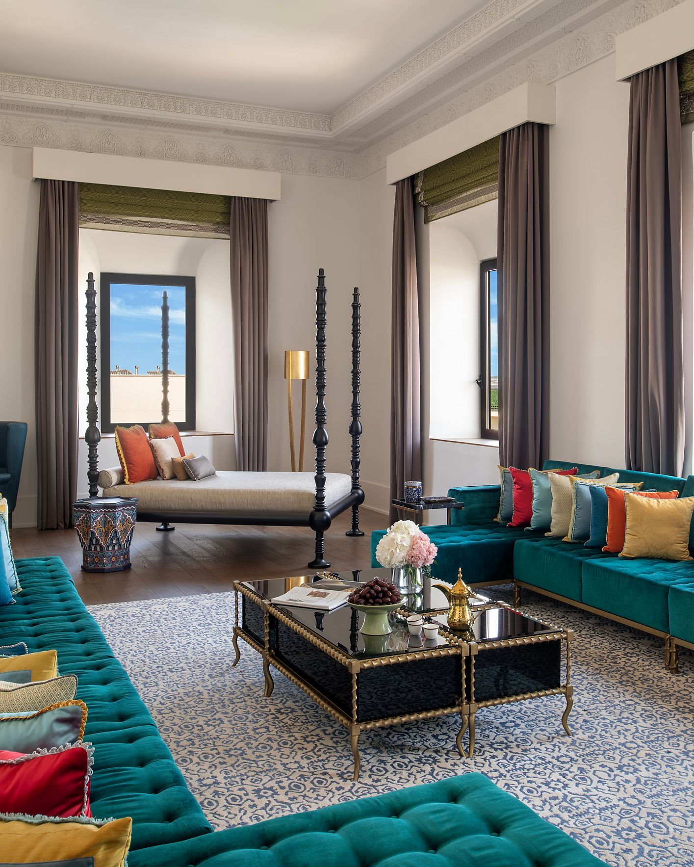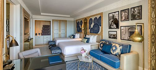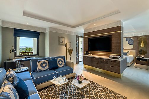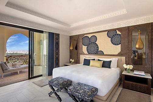 Stunning panoramic view one-bedroom suite featuring a defined bedroom and living area, with contemporary designs mixing traditional Moroccan decor and reflections of the Mediterranean colors, luxurious marble bathroom and large private balcony.