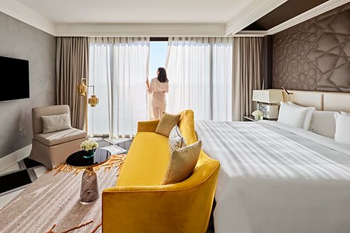 One-bedroom suite on the top floor with stunning views of the city. This suite is elegantly appointed to ensure a perfect comfort and privacy with contemporary room design and a touch of Arab-Andalusian architecture and a luxurious marble bathroom.