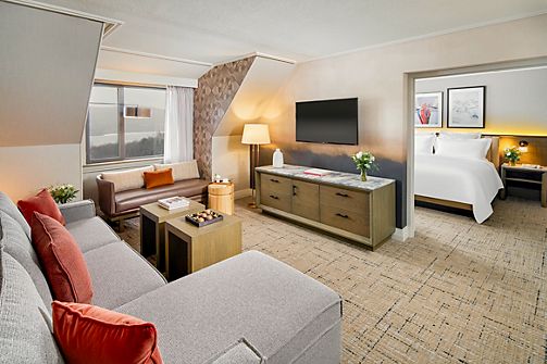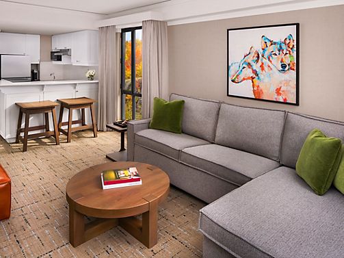 Newly renovated, contemporary alpine chic decor, spacious suite featuring a private bedroom and a separate living room area with a sofa bed