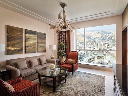 Junior Suite King Kaaba 92m², Room with King size bed, Living Room, One Sofa Bed, 1 Full Bath, 1 Guest toilet, In-suite Mini-bar, In-suite Speakers for Haram Audio, Internet Access, Non-Smoking. Spacious, elegant, and perfect for comfort with outstanding