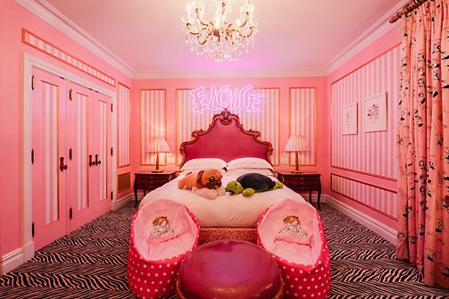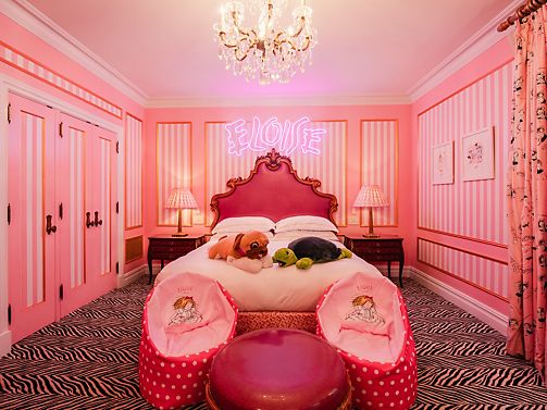 Pink and white Eloise themed suite with Eloise Bedding & towels, Tea Set, Eloise & Weenie dolls.