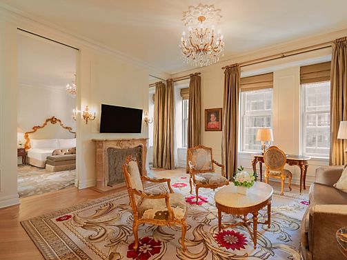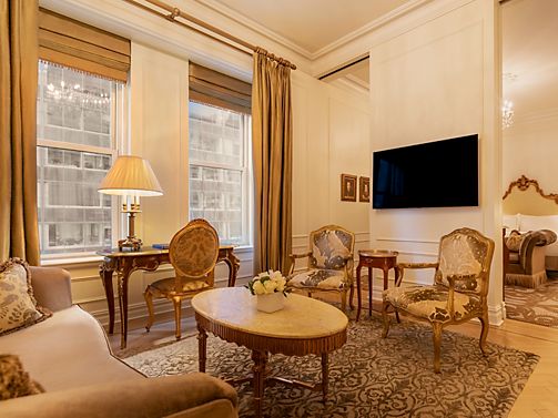 2-bedroom suite overlooks 5th Ave. Large living room, dining area, 2 full bathrooms, claw foot bath tub, and separate shower. Includes butler service.