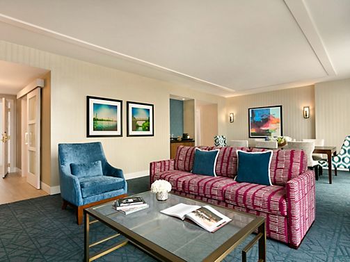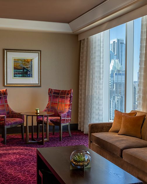 Top Floor Views, Separate Living and Dining, 2 Baths, private fitness space, Wet Bar, Deluxe Amenities, Can Connect to 2nd bedroom with additional reservation upon request. Access to Fairmont Gold Lounge during hours of operation.