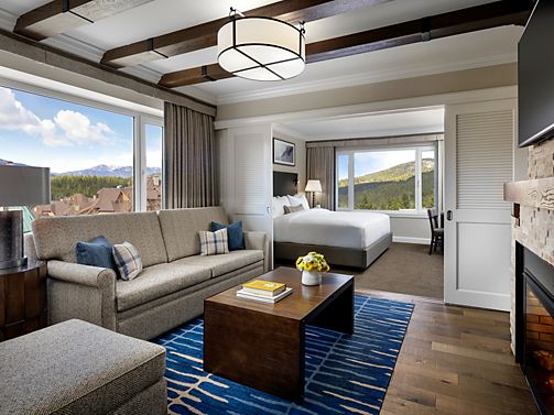 Junior Valley View Suites feature Rainbow Mountain and Whistler Valley Views, 1 King Bed and Double Sofa Bed, Spacious open layout, separate living area with sliding louvre doors, and 4 piece bathroom and 2 televisions. (475 sq.ft /44 sq.m)