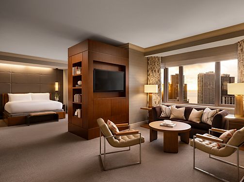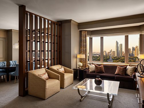 The Presidential suite has a grand foyer, living room, dining room, library with fireplace and grand piano, a bar and butlers pantry, and a bedoom with a Jacuzzi bath. Sweeping views of chicagos skyline and Millennium Park.