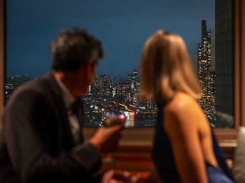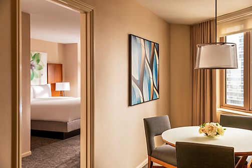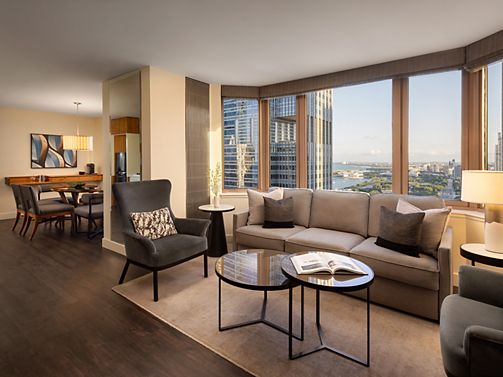 With sweeping city views and an amazing master bath, this suite is just the beginning for a stay to remember. Features dining room, seating area, and spacious bedroom.