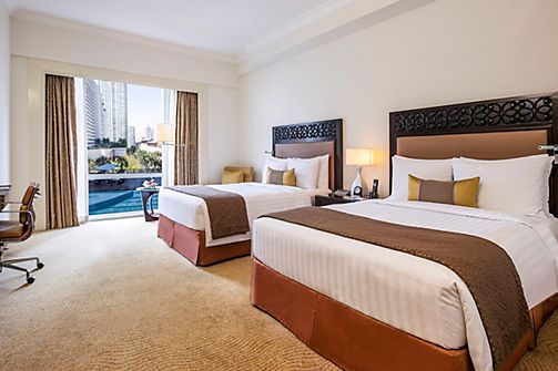 Overlooking the Fairmont Pool, this Deluxe Room offers two double beds and elegant surroundings for a restful stay. A perfect blend of comfort and quiet sophistication awaits in the heart of Makati.