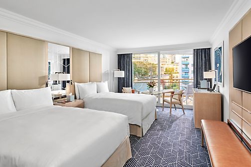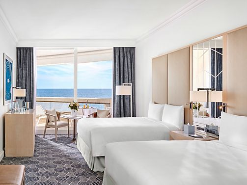 Inspired by the French Riviera and Monaco's heritage, with beige and blue color tones, this renovated 2 double beds room offering a large terrace overlooks the famous hairpin bend. Connected TV, coffee machine and digital technologies available. 35sqm.