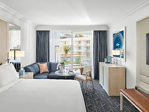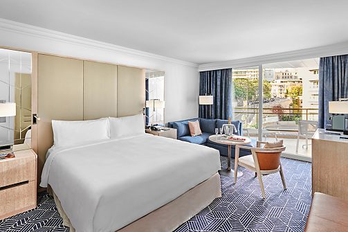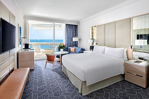 Located on high floors, this room offers connected technologies, blue and beige color design. Perfect to enjoy a breathtaking view of the Mediteranean Sea on the private terrace. Connected TV, coffee machine and digital technologies available. 35sqm.