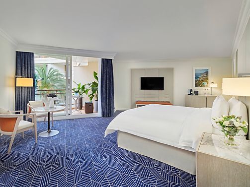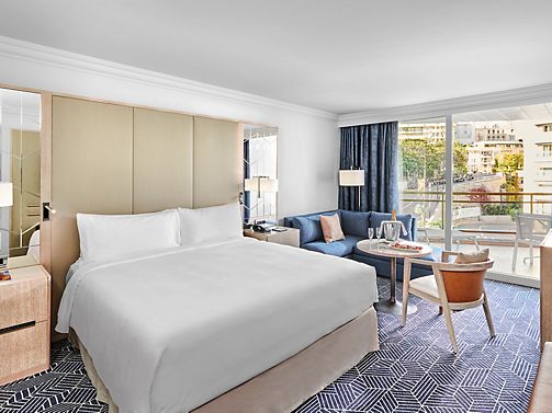 Inspired by Monaco's heritage with beige and blue color tones and elegant bathroom, this renovated room offers a large terrace overlooking the lush garden of the hotel. Connected TV, coffee machine and digital technologies available. 35sqm.