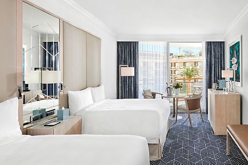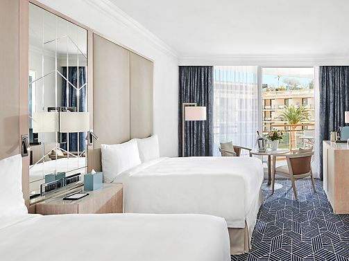 Inspired by Monaco's heritage with beige and blue color tones and elegant bathroom, this renovated double beds room offers a large terrace overlooking the lush garden of the hotel. Connected TV, coffee machine and digital technologies available. 35sqm.