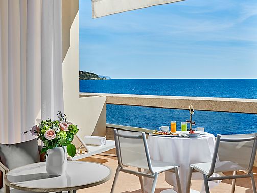 Our spacious renovated suites benefit from a tremendous sea view. An independant living room invites you to relax and the terrace allows you to enjoy the magical view across the sea. Connected TV, coffee machine and digital technologies available. 70sqm.
