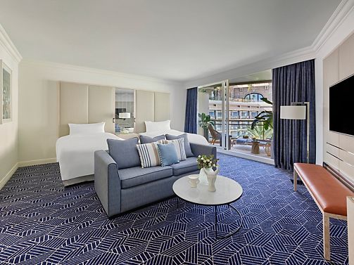 Inspired by Monaco's heritage, with beige and blue color tones, this newly renovated suite offers three private balconies overlooking the famous hairpin bend and the marina. Connected TV, coffee machine, digital technologies available. 85sqm.