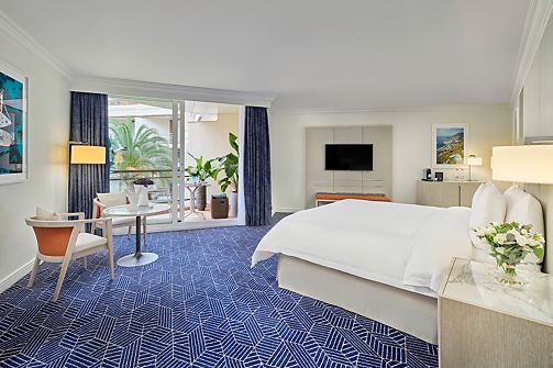 This renovated 35sqm room features chic décor in beige and blue, elegant furnishings, modern technology, a refined bathroom, and a private terrace with stunning Mediterranean Sea views.