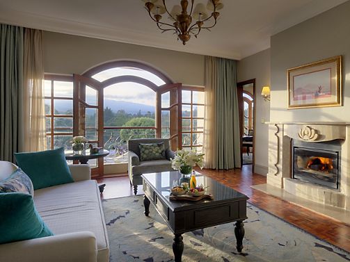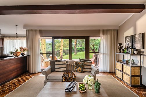 A spacious and elegant suite featuring a living area with sofa and a cosy fireplace with great views of the magnificent Mount Kenya or the expansive garden.