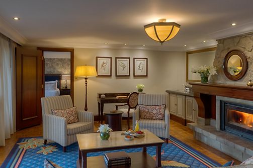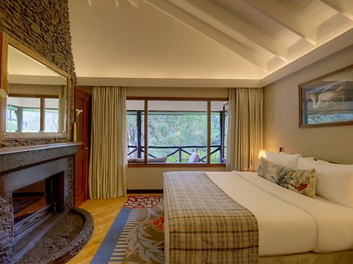 A one Bedroom spacious Suite which features a traditional decor designed with elegance and comfort. Comfortable living area with sofa bed, a beautiful stone fire place and a private terrace overlooking the forest.
