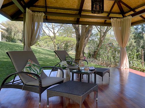 Located walking distance from the main building, the suite provides a living room area with sofa bed and a stone fire place. The private terrace is overlooking the lawn, the coffee and tea garden with a magnificent view on the Mount Kenya.