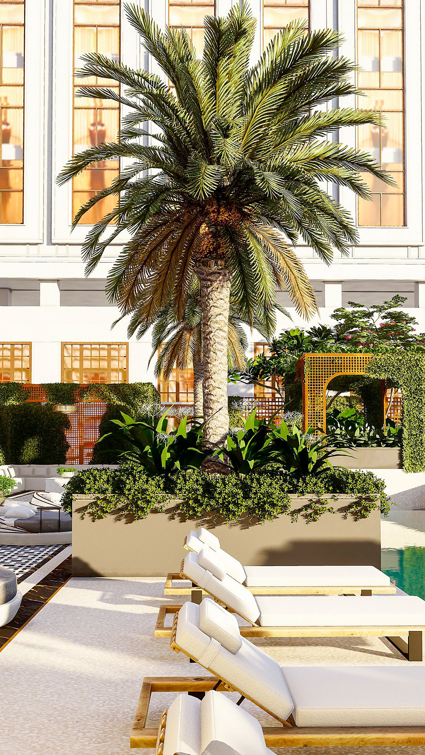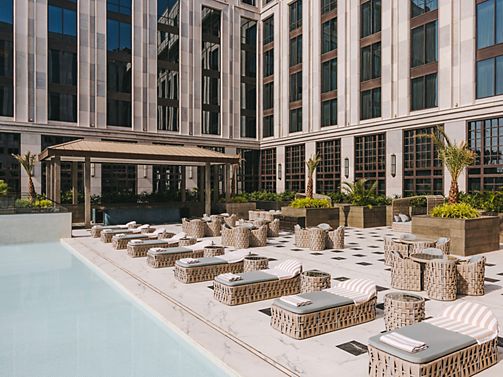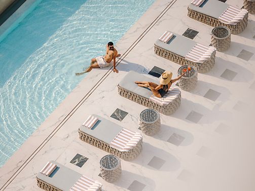 Bask in the vibrant pool view from this elegantly designed room with twin beds. Rich textures and modern accents create a tranquil escape, perfect for relaxation or business travel.