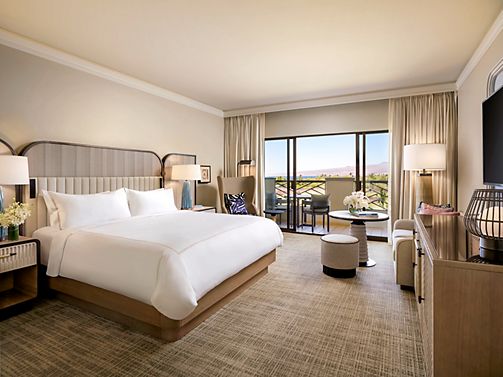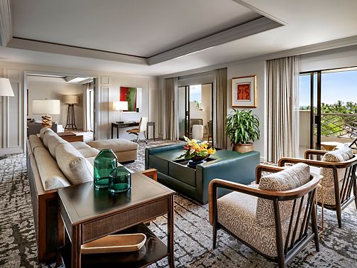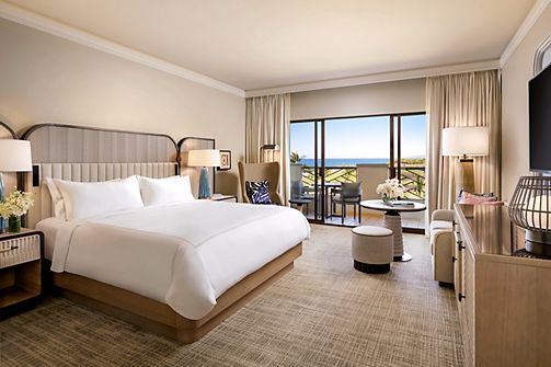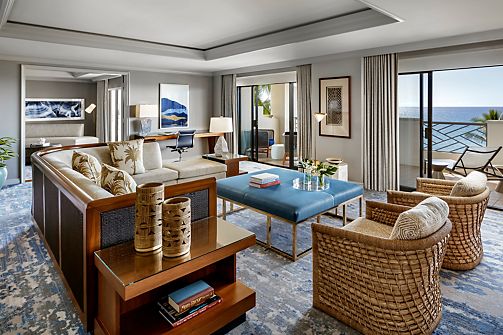 A spacious guest suite, residential in style, with views of the Pacific Ocean from a private patio. Offers a parlor area separated from the bedroom by French doors, wood and marble coffee console & writing desk. Includes Fairmont Gold services.