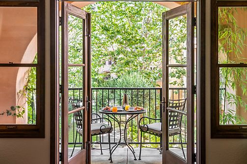 Garden views with exclusive balcony. Spacious suite featuring charming wood-burning fireplace, sitting area with sofabed. Bathroom with oversized soaking bathtub and separate shower.
