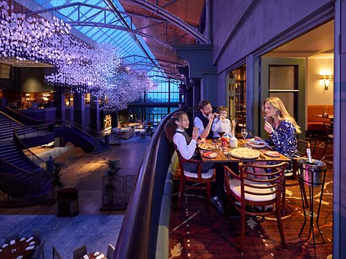 Atrium Rooms feature two queen beds, bathroom with separate shower and bathtub, with limited views over our glass roofed Atrium.
