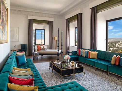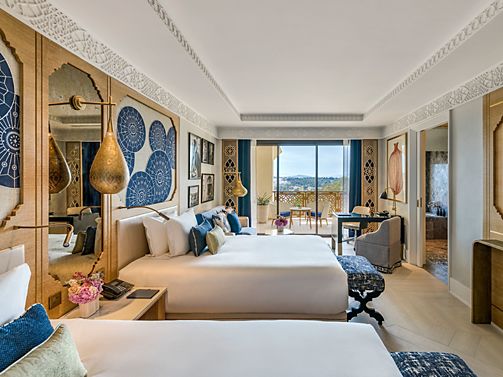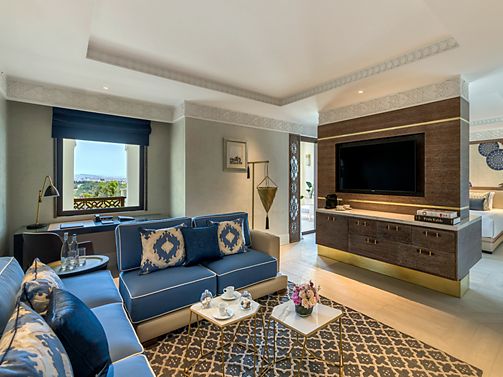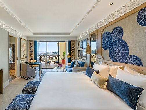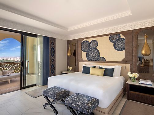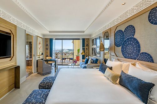 Stunning panoramic view one-bedroom suite featuring a defined bedroom and living area, with contemporary designs mixing traditional Moroccan decor and reflections of the Mediterranean colors, luxurious marble bathroom and large private balcony.