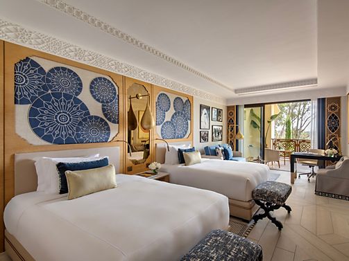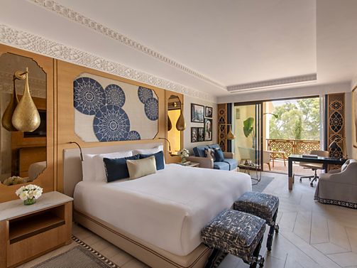 Marvelous forest view one-bedroom suite featuring a defined bedroom and living area, with contemporary designs mixing traditional Moroccan decor and reflections of the Mediterranean colors, luxurious marble bathroom and large private balcony.