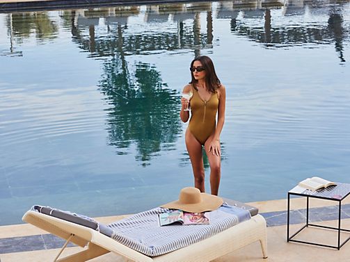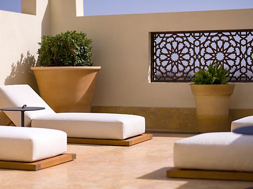This room offers a refreshing private garden terrace of 11 m², a magnificent bedroom with an integrated lounge and a luxurious marble bathroom. The eclectic room design mixes traditional Moroccan decor with reflections of the Mediterranean colors.