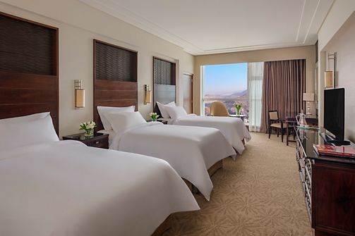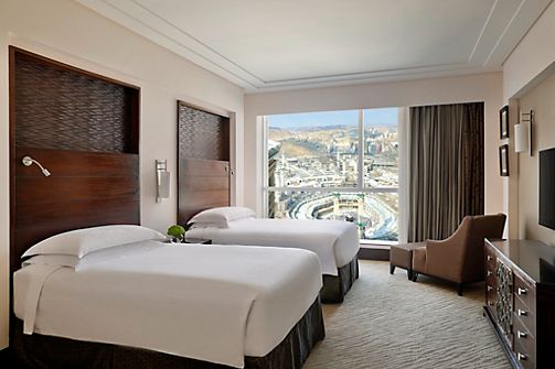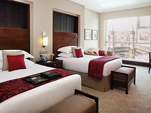 Fairmont Gold Twin Haram 42m², Room with Twin Bed, Full Bath, 32" LCD/ TV, Coffee / Tea Refreshment Center, In-room Speakers for Haram Audio, Non-Smoking. Elegant and comfortable, offering a serene experience with stunning views and exceptional service.