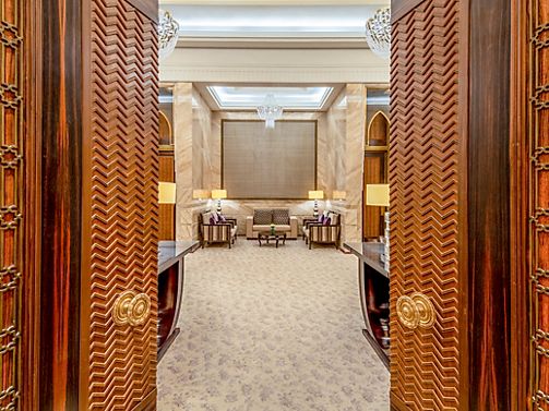 Indulge in unmatched luxury at the Royal Suite Kaaba, 270m², featuring a king-size bed, walk-in wardrobe, separate living and dining rooms, office and prayer areas, and a full bath with a massage room. Perfect for ultimate relaxation and comfort.